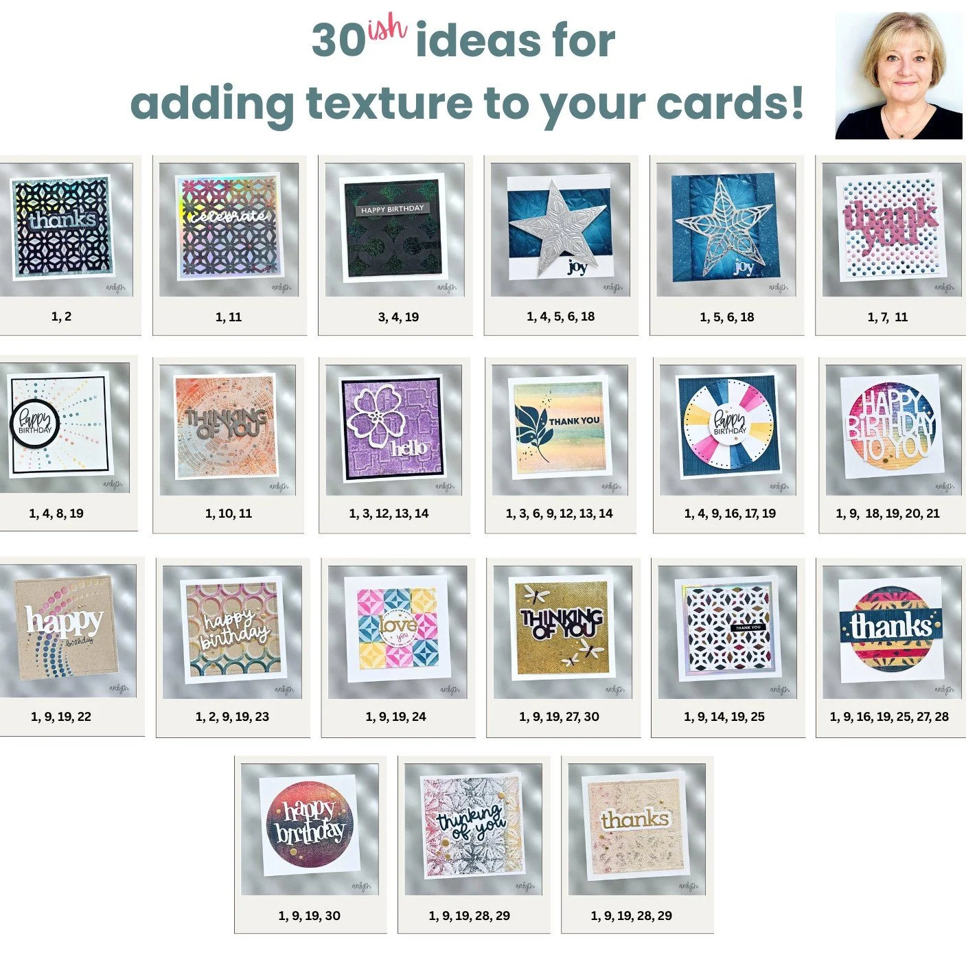 Today’s video has 12 cards with even more ideas for adding texture to your cards. In total, I ended up with about 30 texture-technique ideas. In fact, there’s so many, I wrote them all down for you so you can give them a try too! Click the image below to link to a free printable pdf.