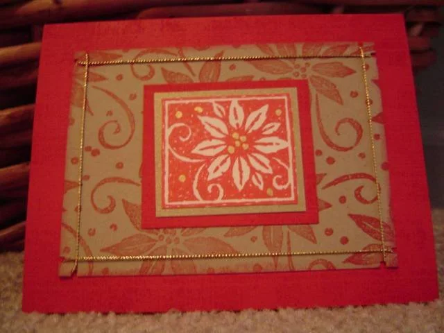 LIST: Colours (red, white, gold, kraft) , Techniques (stamping) , Elements (red stamping on kraft, poinsettias, white poinsettia focal point with gold border, gold twine, no sentiment)