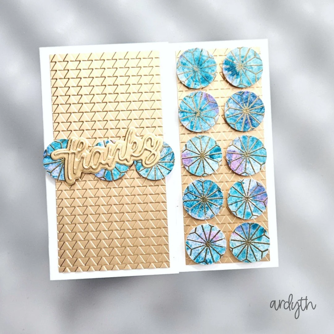 The geometric pattern on my inspiration is a favourite of mine and I knew right away I would use heat embossing and an old Altenew stamp to get the look. But when I added watercolour, the effect was not what I was looking for, so I pivoted, and created my dots out of the panel instead.