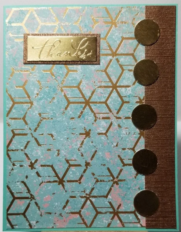 LIST: Colours (aqua, pink, white, gold, ) , Techniques (stamping, embossing, die cutting) , Elements (aqua panel with distressed geometric pattern, tone on told gold embossing, 5 vertical circles)