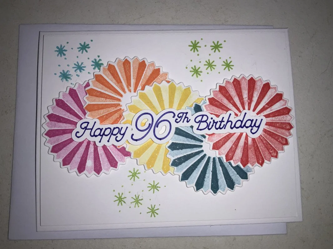 LIST: Colours (white, pink, orange, yellow, blue, red, green) , Techniques (stamping, die cutting, Cricut lettering?) , Elements (5 ‘dimensional’ circular fans, script birthday sentiment, stamped stars)