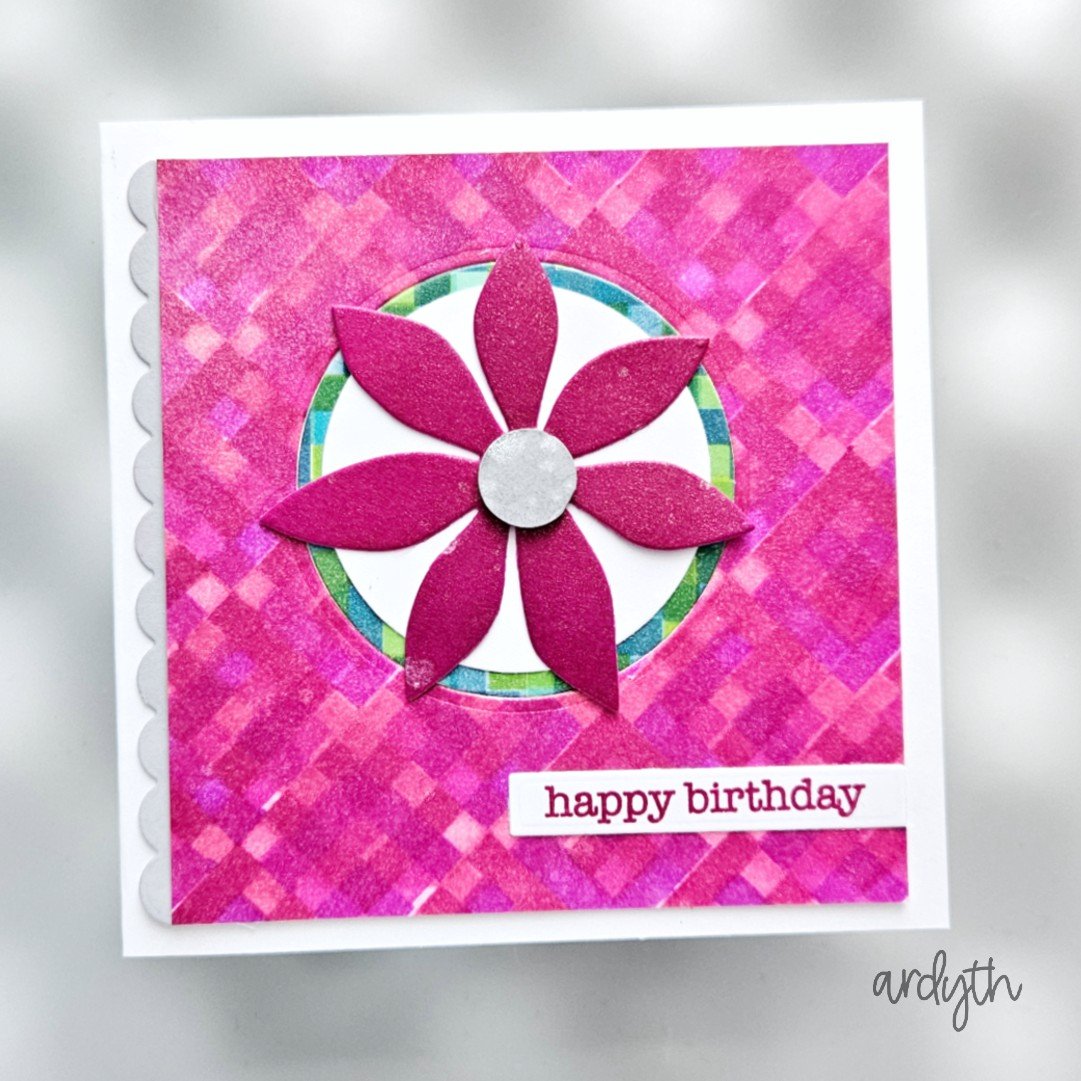 MODIFY: background is stenciled, flower is die cut, red is more pink, green included as a frame, rather than leaf and stems, grey scallop along full left side, birthday instead of hello