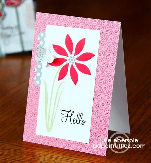 INCLUDE: stamping, die cutting, patterned background, red flower with grey centre, grey scallops