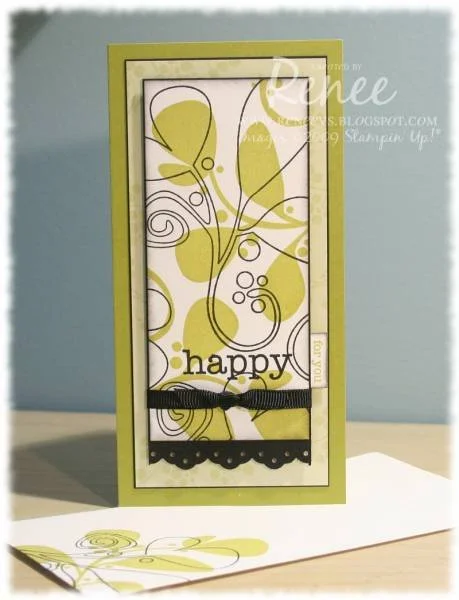 LIST: Colours (olive, black, white) , Techniques (overlapping stamping) , Elements (slimline card, mod solid and outline botanical stamps, stamped sentiment, ribbon, black die cut border, tab sub sentiment on side)