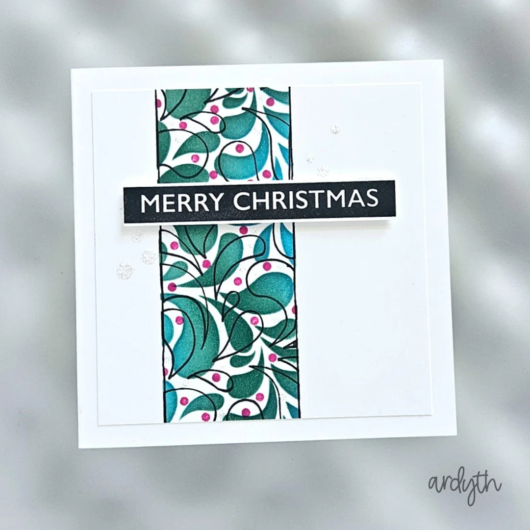 MODIFY: deepened the colours and added red dots/berries, stencil instead of stamping, solid sentiment instead of ribbon and black border, narrow strip of stenciling instead of slimline card