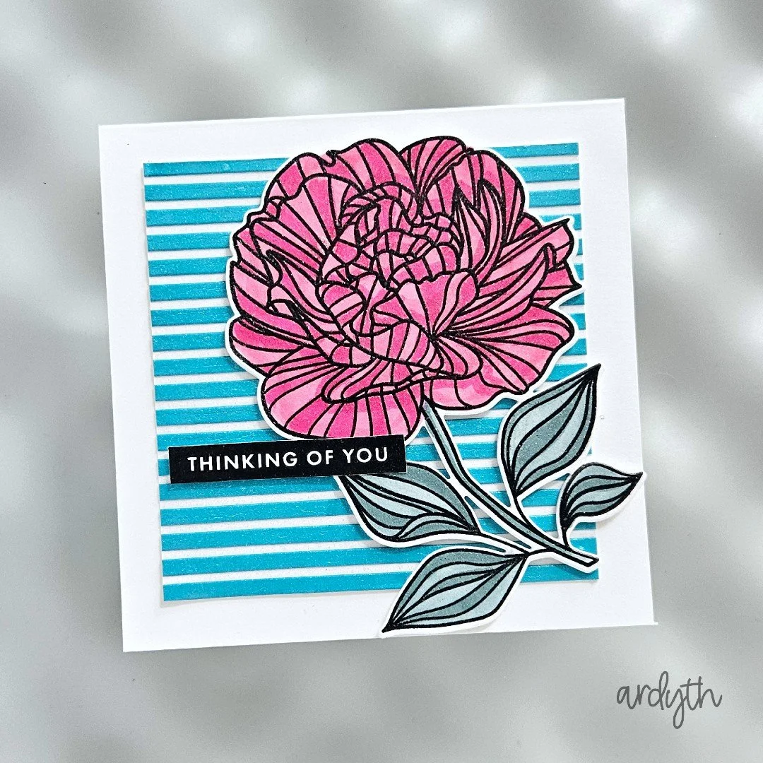 That big pink flower is stunning, and I just purchased a new floral set with roses. I coloured one rose with two tones of pink and green, using the stripes in the design to tie into my die cut striped background.