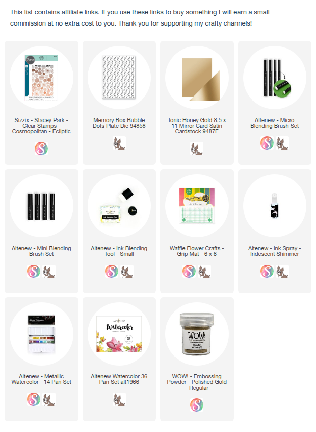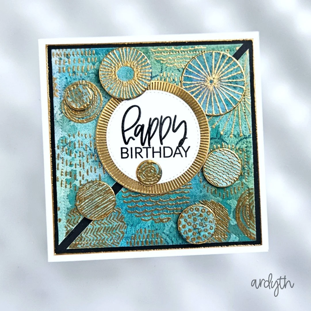 I have been really enjoying playing with simple watercolour techniques lately, and this one is the easiest. Just put down blobs of colour and layer them up to create a pretty, varied background. I stamped a delicate stamp over top and embossed it with shiny gold powder. I guess other than the watercolour, the main connection to my inspiration is the diagonal split although again, mine is slightly different. And then I just couldn’t resist using the leftovers of my A2 panel to cut some circles to add interest and dimension.