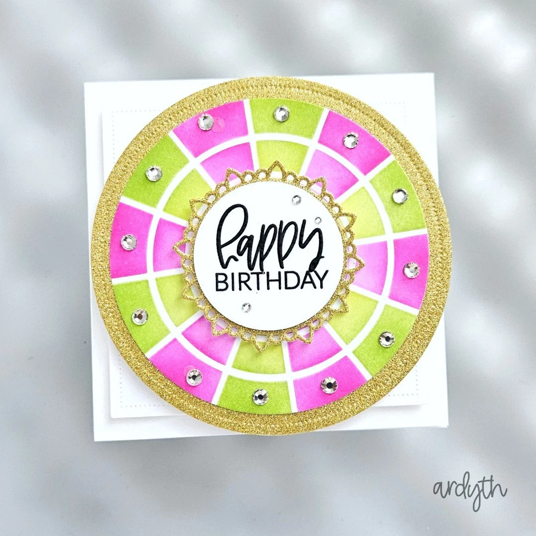 My inspiration reminded me that I have a colour wheel stencil set with layers to make it easy to get all the colours in the right place. My niece is turning 10 soon, and that dictated my “Wicked” colour scheme. I used a Pearblossom Press snap to turn my wheel into a spinner and I glued the sentiment directly to the snap (and the snap to the card base) so it wouldn’t spin with the wheel.